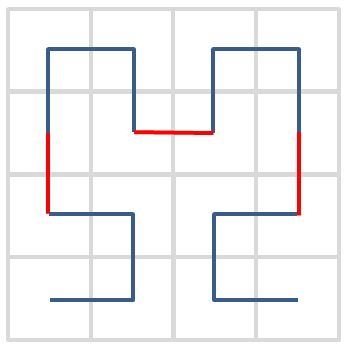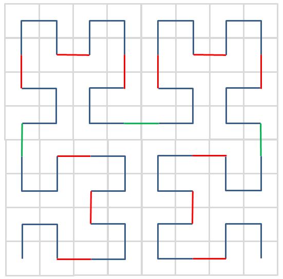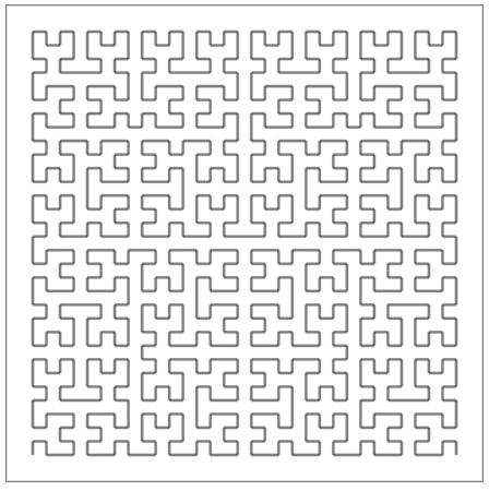 希爾伯特曲線(Hilbert curve)是由 David Hilbert 在 1891 年提出,可以填滿空間的碎形曲線,一階希爾伯特曲線是個通過四個網格中心點的 ⊓ 曲線: