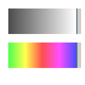 雙色漸層色譜兩個顏色之間的漸層變化,這樣的漸層變化適用於陰影色彩的指定,這邊介紹的色譜起始與結束顏色的指定可以是16色模式中的0∼7號顏色。多色漸層色譜
