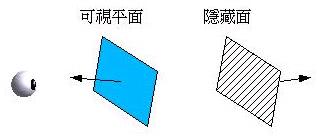 法線向量判定法適用於無凹陷的凸多面體,例如正多面體或水晶球,其原理為求出每個面的法線向量,如果法線向量的Z 分量大於0(即面朝向我們),則該面為可視,如果法線向量的Z分量小於0,則看不到那個面,則這是個隱藏面,所以無需繪製。