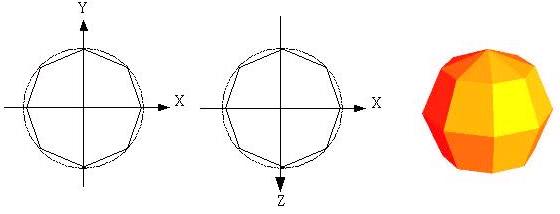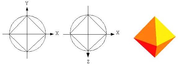 看似複雜的水晶球,其實只要有一個規則可以輕易的求出每一個頂點,我們先使用一個圓球,然後用XY平面的橫剖面說明,在XY象限的90度中 若只有一個平面,則訂N為1,每個象限依此處理,此時可以定出四個頂點,然後將這四個頂點以旋轉體來處理,從XZ象限來訂出旋轉角度,N等於1時必須 以90度旋轉四次,使用此方法所畫出的是一個八面體,如下所示: