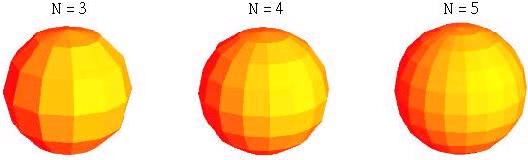 當橫剖面於各個象限的平面分割數越多,也就是N越大時,所畫出的圖形會越接近圓形,例如以下是從N等於3至N等於5的幾個圖形:
