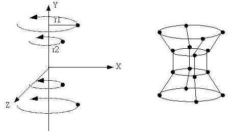 假設旋轉體是繞著Y軸旋轉,則可以先定義出一條錂線上的頂點,與它們各自距Y軸的距離,接下來只要旋轉這些頂點,就可以得出旋轉體所有的頂點,如下所示: