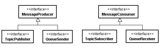 而JMS中對於訊息產生者、訊息消費者的定義則分別為MessageProducer與MessageConsumer介面,而在兩種模式下,分別有發佈 者(Publisher)、傳送者(Sender),以及訂閱者(Subscriber)、接收者(Receiver),這分別都定義為MessageProducer的子介面TopicPublisher、QueueSender,以及MessageConsumer的子介面TopicSubscriber、QueueReceiver來定義。