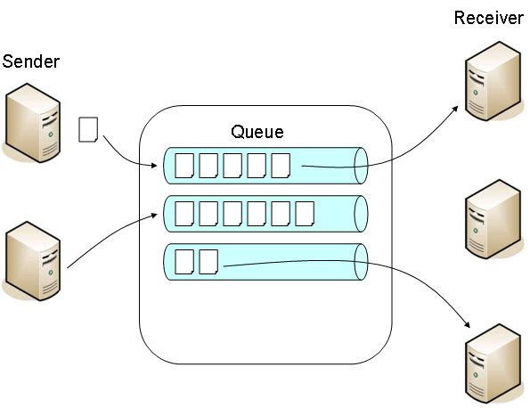 點對點模式下,佇列會保留訊息至接收者取出為主,因此佇列亦扮演緩衝區的作用,多個接收者可以使用同一個佇列,但佇列中的每個訊息只能被其中一個接收者取得,佇列中的訊息如何分配給接收者,由個別伺服器決定。